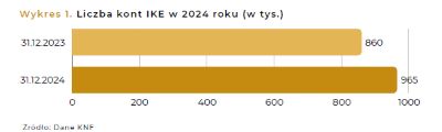 Na koniec 2023 roku funkcjonowało w Polsce prawie 860 tysięcy IKE, a na koniec 2024 roku liczba ta zwiększyła się do prawie 965 tysięcy kont. Delta zmiany jest konsekwencją otwartych w ciągu 2024 roku ponad 169 tysięcy nowych kont IKE oraz zamknięcia z różnych powodów (zwroty, wypłaty, wypłaty transferowe) kilkudziesięciu tysięcy istniejących kont. Netto w ciągu roku liczba kont IKE zwiększyła się więc o 104 tysiące, a więc o ponad 12%.
